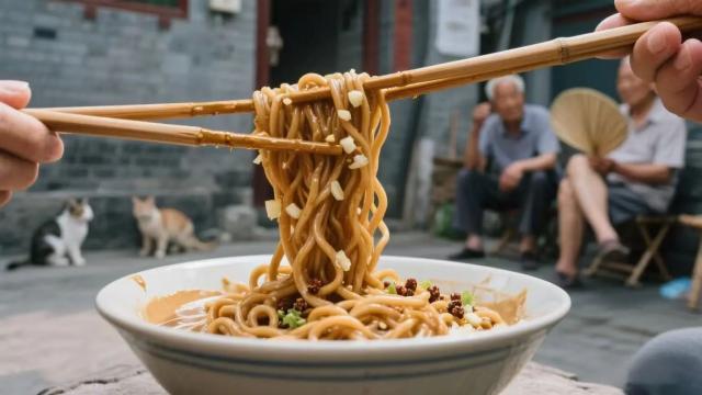 碼菜也有講究:黃瓜絲要切得細如發(fā)絲,綠豆芽得用沸水焯到斷生,再配上點焯過的菠菜段。把醬一澆,菜一撒,筷子攪開的瞬間,芝麻香混著菜香直往鼻子里鉆,呼嚕嚕吃下去,額頭上冒點小汗,暑氣全消。